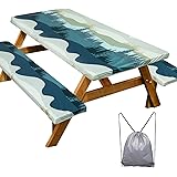 Picnic Table Cover with Bench Covers Camping Essentials Waterproof Windproof Camping Tablecloth with Drawstring Bag, Fitted Rectangle Tables and Seats, 72in, Green Blue
